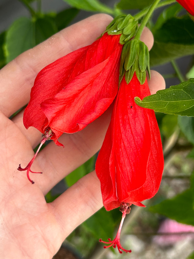 Turk’s Cap Hibiscus is a versatile shrub that produces an enormous amount of bright red, edible sweet flowers.  The flowers can be eaten fresh - enjoy that sweet nectar! - and  can also be dried and made in to tea or jelly. The young leaves of this plant can be steamed and eaten like spinach.  The flowers attracts also attract many pollinators and hummingbirds and the fruit is eaten by birds.  This plant is a favorite here at the nursery, loved equally by humans, insects, and wildlife.