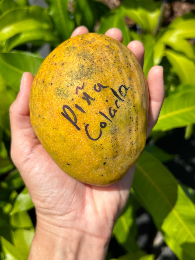 ‘Piña Colada’ is a small fruit with big flavor, a very sweet and pleasant taste which does resemble its name when at peak ripeness.  The trees are not vigorous and should be easy to maintain, although they do tend to exhibit nutritional deficiencies more easily than other mangos.  Unfortunately even in the best mango seasons, Piña Colada doesn’t impress with production due to the small fruit size which is usually 1/2lb or less.  Despite this, the flavor is worth growing it for, especially for those near the coast.