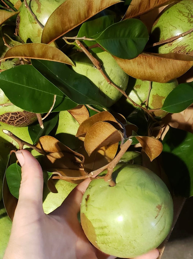 Caimito, also called Star Apple or milk fruit, is a distant relative of the Sapodilla, Canistel, and Mamey.  The tree is gorgeous, with deep green leaves whose underside is a striking bronze color.  Caimito fruit is round, baseball sized, and usually either light green or deep purple at maturity.  The flavor is very sweet, somewhere between the taste of coconut and grape.  The flesh is firm with a gelatinous texture, and has a white milky juice with a slight sticky latex near the skin.  They are best eaten cut in half and the flesh scooped out with a spoon.