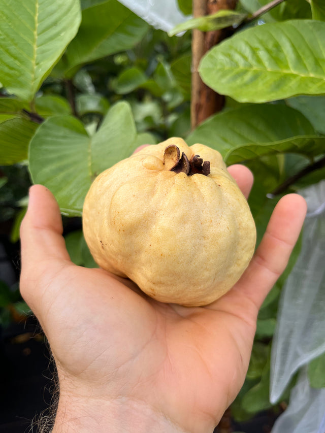 This is a rare guava variety we obtained from our friend Celeste in Sarasota, FL. The fruit is a tan/beige color when ripe, with a shape that is overall round, but sometimes has pumpkin-like ridges. A large one can be the size of a softball. The unique and appealing thing about this guava is that it’s completely seedless– there is only a small, empty seed cavity at the center of the fruit. The fruit is very fragrant with a strong guava aroma, and because it’s seedless the texture is different from other guavas, almost like biting into a fine pear. From our experience, this seedless guava variety is fairly resistant to fruit flies as well, as long as it’s not left to become overripe. These are grafted or air-layered trees.